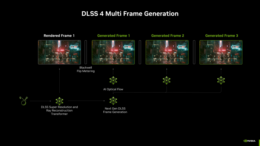 La gran innovación de DLSS 4 es la Multi-Frame Generation. En esta nueva versión, la inteligencia artificial es capaz de generar hasta tres fotogramas adicionales por cada frame renderizado de forma nativa por la GPU.