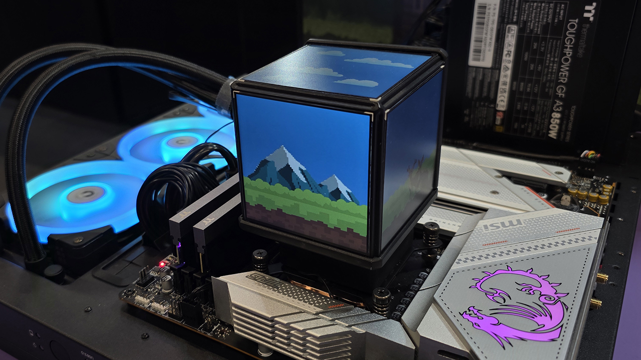 La Minecube 360 Ultra ARGB Sync es una declaración visual. En lugar del típico bloque de agua, monta cuatro pantallas LCD de 3,95″ con resolución 720×720, cada una personalizable mediante TT RGB Plus para mostrar desde estadísticas hasta GIFs o tus memes favoritos.