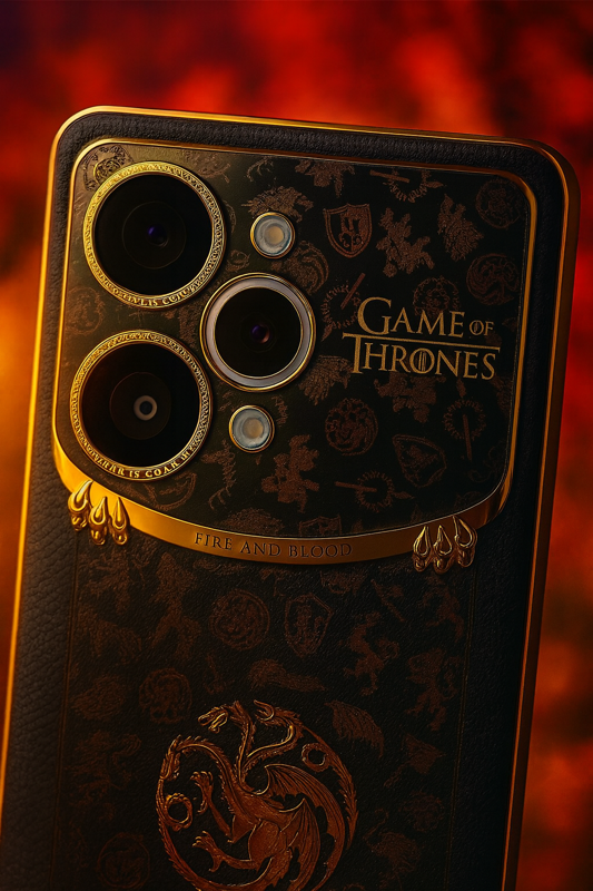 En el centro, un emblema grabado de la Casa Targaryen domina la superficie, acompañado de grabados de otras casas y el lema “Fire and Blood” alrededor del módulo de cámara, rodeado por un marco dorado con relieves en forma de garras de dragón.