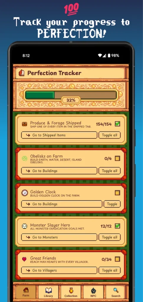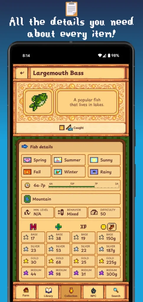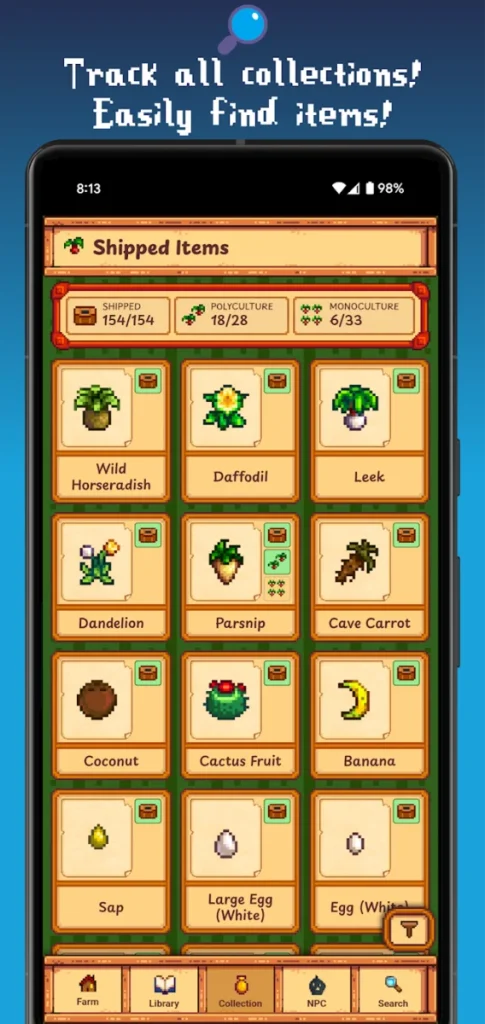 Gunther’s Library no es solo una app de ayuda: es un auténtico compañero de juego. Permite llevar un control detallado de la progresión en la partida: desde las colecciones del Centro Cívico y la ruta de Joja, hasta los gustos y regalos de cada aldeano. También cuenta con una base de datos completa de objetos, ideal para quienes odian saltar de pestaña en pestaña de la wiki mientras cultivan o pescan.