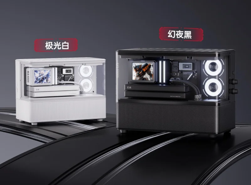 El nuevo Edifier New Cyber parece salido de un concurso de modding. La parte superior de la carcasa es transparente, revelando componentes que simulan una GPU con ventiladores LED y hasta módulos de memoria RAM falsos, todo cuidadosamente iluminado. En el centro destaca una pantalla táctil de 2,8 pulgadas, donde el usuario puede ver animaciones personalizadas o el estado real del sistema: uso del procesador, de la gráfica y de la memoria.