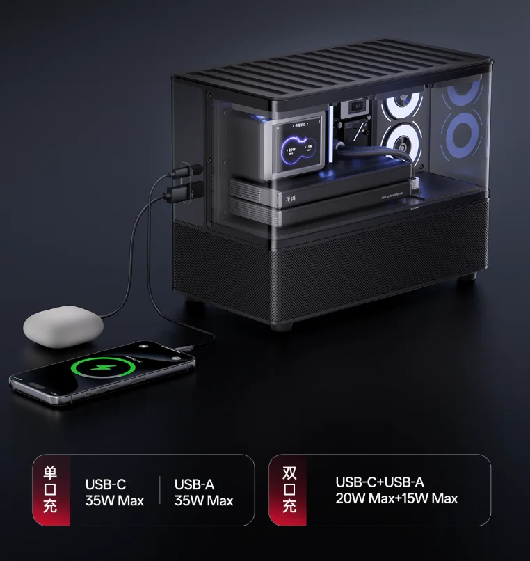 Para reforzar la ilusión de una “PC viva”, los cables trenzados gruesos recuerdan a los tubos de una refrigeración líquida. Edifier incluso ha incluido puertos USB-A y USB-C en la parte trasera, con carga rápida de hasta 35 W, lo que lo convierte en un práctico hub para el escritorio.