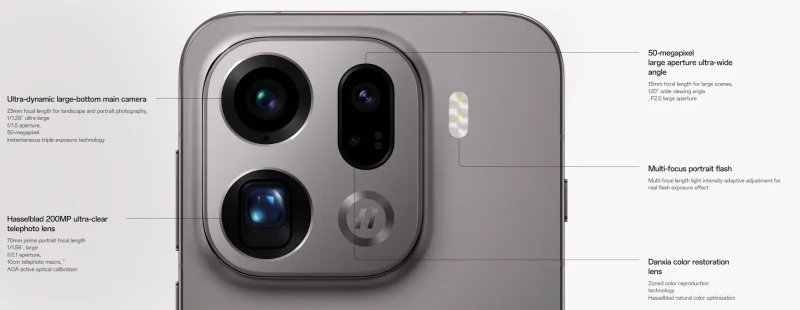 Oppo vuelve a apostar fuerte por la fotografía móvil, y lo hace con la colaboración de Hasselblad, firma legendaria en el mundo de la imagen. El Find X9 Pro integra un sistema Hasselblad Master Camera System impulsado por el motor de imagen Lumo, que gestiona un trío de sensores principales: