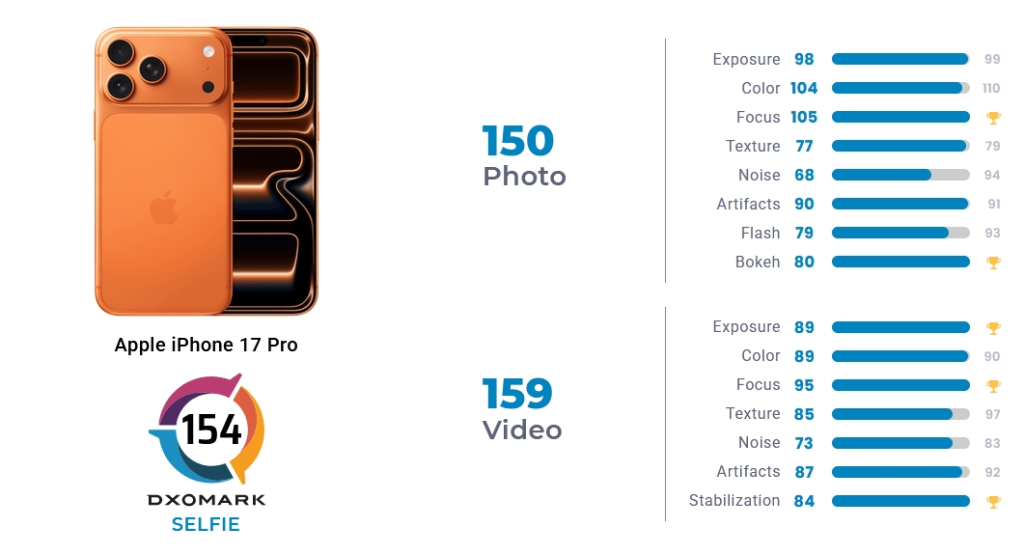 En DxOMark, el iPhone 17 Pro alcanzó 154 puntos, superando al Honor Magic6 Pro y al propio iPhone 16 Pro (ambos con 151).