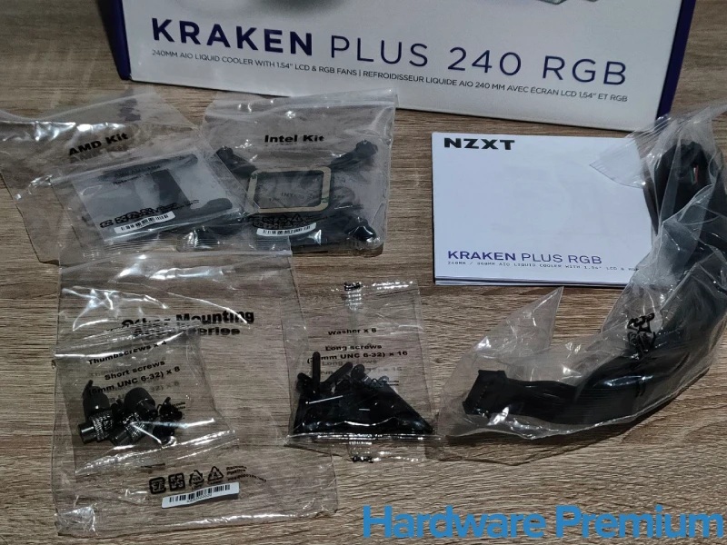 El apartado de accesorios de la NZXT Kraken Plus 240 RGB está muy bien cuidado, demostrando que la marca no deja nada al azar. Todo viene perfectamente clasificado en bolsas individuales etiquetadas, lo que facilita enormemente el proceso de montaje. Se incluyen dos kits completos de montaje, uno para AMD (AM4/AM5) y otro para Intel preinstalado (LGA 115X, 1200, 1700 y 1851), cada uno con su backplate, anclajes y tornillería específica.