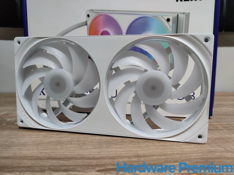Los ventiladores F240 RGB Core incluidos con la NZXT Kraken Plus 240 RGB representan una evolución notable. Su diseño es completamente neutro, con un marco de líneas limpias y sin detalles innecesarios, salvo por el discreto logotipo de NZXT grabado en una esquina.