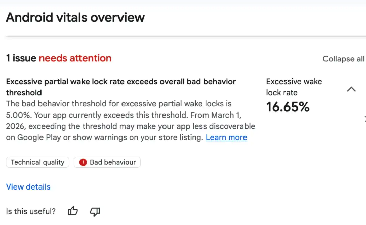 Según los detalles oficiales, una app será marcada si más del 5 % de sus sesiones de usuario en los últimos 28 días superan ese límite de consumo. Los desarrolladores podrán usar herramientas de diagnóstico integradas en la consola de Google Play. Así pueden detectar y corregir el problema antes de que afecte a su reputación.