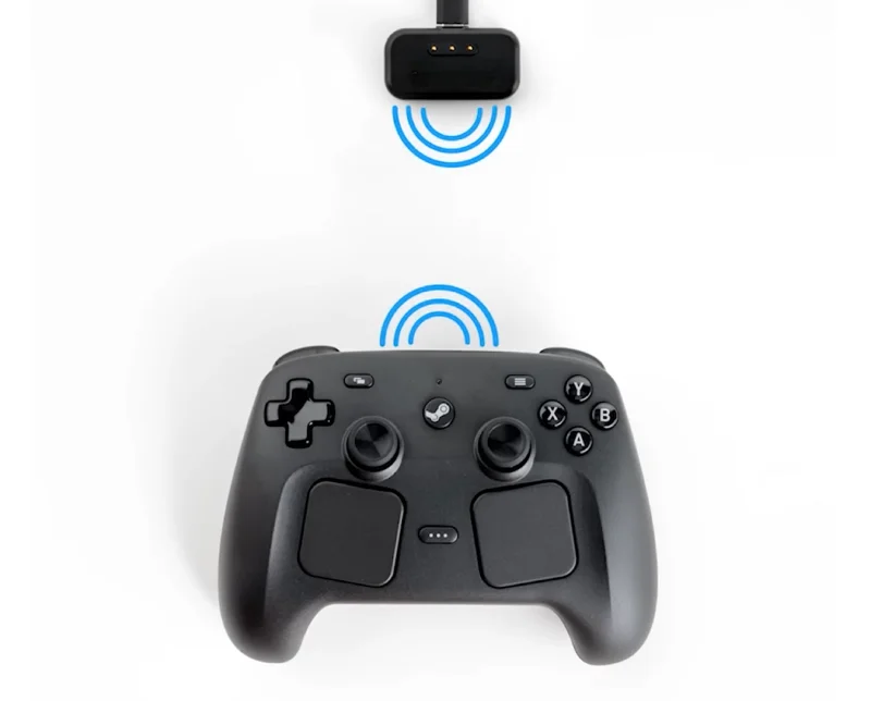 El Steam Controller también vuelve. Más ergonómico, más clásico, pero sin perder su ADN experimental. Dos joysticks magnéticos TMR para evitar drift, touchpads reposicionados, paletas traseras personalizables y una latencia de solo 8 ms con su dongle dedicado. La batería promete 35 horas de autonomía y conectividad tanto por USB como por Bluetooth.
