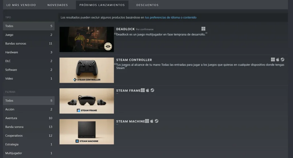Pero en el escaparate de Steam aparece algo extraño: cinco lanzamientos próximos. Cuatro tienen nombre: Deadlock, Steam Machine, Steam Frame y Steam Controller. El quinto, en cambio, está ahí… y no está.