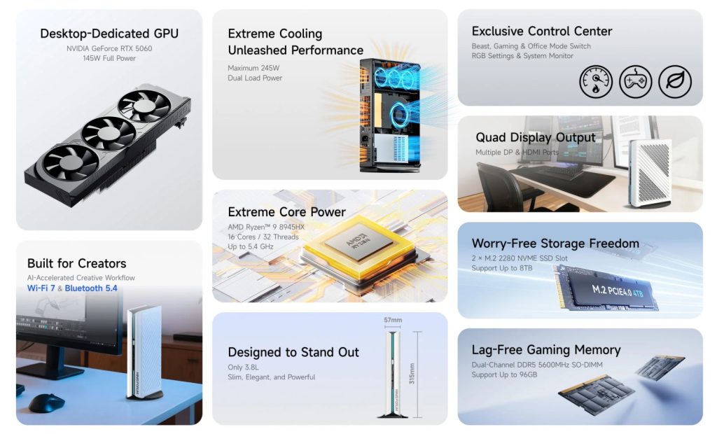 En el interior del AtomMan G1 Pro late un AMD Ryzen 9 8945HX Dragon Range, un procesador de 16 núcleos y 32 hilos capaz de funcionar en modos de 60W, 80W o 100W, dependiendo de la carga. Lo acompaña una NVIDIA GeForce RTX 5060 de escritorio, con 8 GB de VRAM y un consumo máximo de 145W, suficiente para mover títulos actuales en 1080p y 1440p con soltura, además de controlar hasta cuatro pantallas 4K simultáneas.