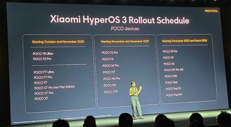 Xiaomi llevaba semanas manteniendo la versión oficial: HyperOS 3 llegaría de forma escalonada, con los POCO F8 Pro y F8 Ultra presumiendo de estrenar el firmware. Sin embargo, la compañía ha retocado el plan y, según la hoja interna mostrada durante el evento, estos dos modelos ahora encabezan formalmente el despliegue pese a que la familia POCO F7 ya recibió la actualización días atrás.
