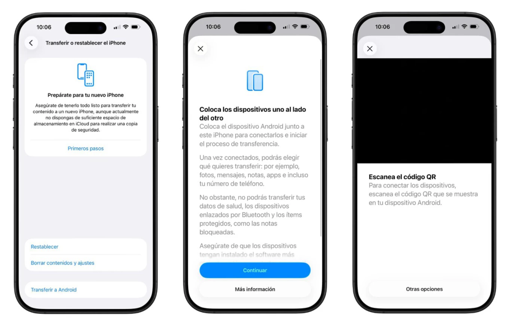 El método es directo: acercas ambos dispositivos, escaneas un código QR y comienza la migración inalámbrica. Fotos, mensajes, notas y aplicaciones compatibles viajan al nuevo terminal con una fluidez inédita en iOS. Por motivos de seguridad, algunos datos quedan fuera —Salud, emparejamientos Bluetooth o notas bloqueadas—, pero el salto cualitativo es evidente. Apple no solo cumple con regulaciones; redefine el relato de la interoperabilidad.