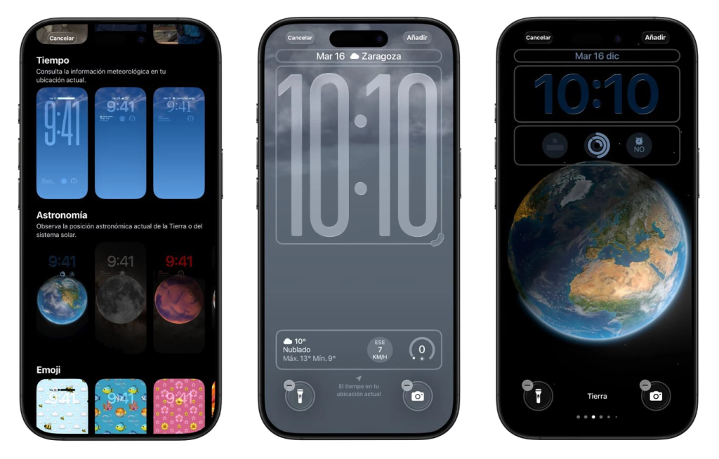 En cambio, la personalización visual avanza con pasos pequeños pero claros. Apple reorganiza el menú de fondos de pantalla, separando “Tiempo” y “Astronomía” en categorías distintas y añadiendo nuevos fondos preconfigurados. No es una revolución estética, pero sí una limpieza necesaria.