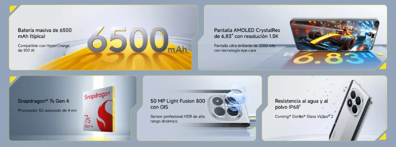 Todo este conjunto se apoya en una batería de 6.500 mAh, compatible con carga rápida de 100 W y carga inversa de 22,5 W. Números que apuntan directamente a usuarios intensivos que no quieren vivir pendientes del cargador.