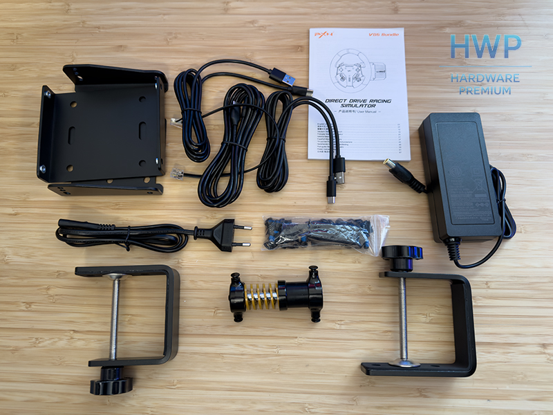 Dentro, PXN incluye todos los cables esenciales: alimentación, USB-C para PC y cables específicos para pedales y periféricos. También se incluye un set básico de tornillos y arandelas para montaje rápido. No hay manual voluminoso, sino una guía rápida de inicio con imágenes claras. Quizas un manual más detallado hubiera sido útil, sobre todo si es tu primera base direct drive.