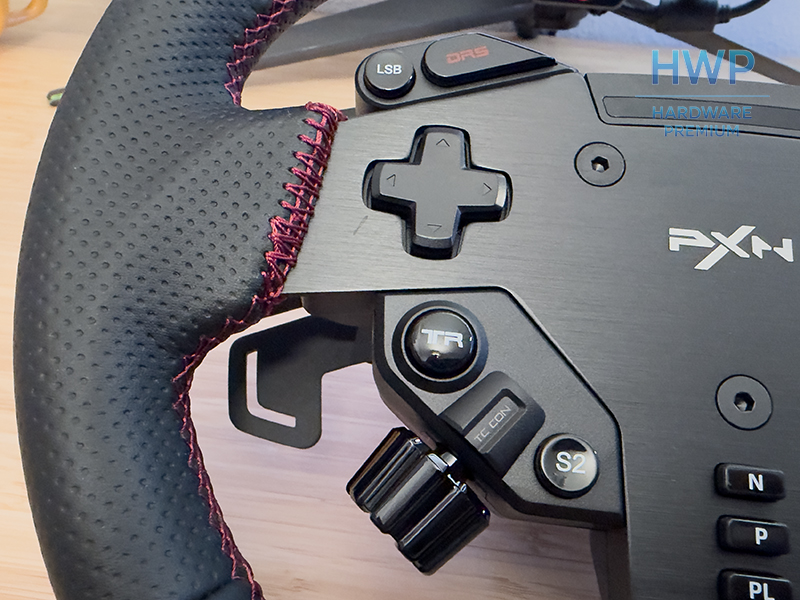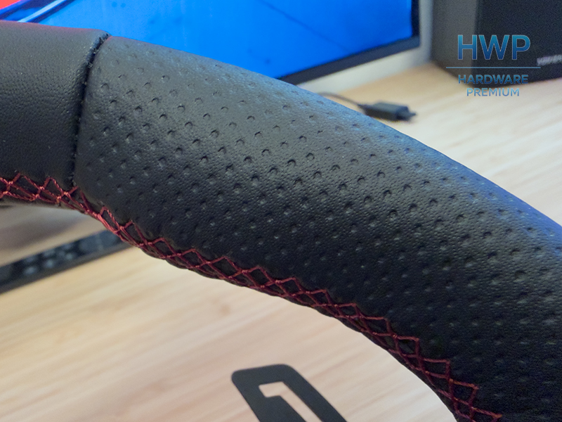 El aro es D-shape y está cubierto con un material sintético que PXN llama “ultra fiber leather”. No es cuero premium, pero el tacto es correcto y el agarre responde bien incluso en sesiones largas. El microperforado en algunas zonas ayuda a mantener las manos secas cuando empiezan a sudar.