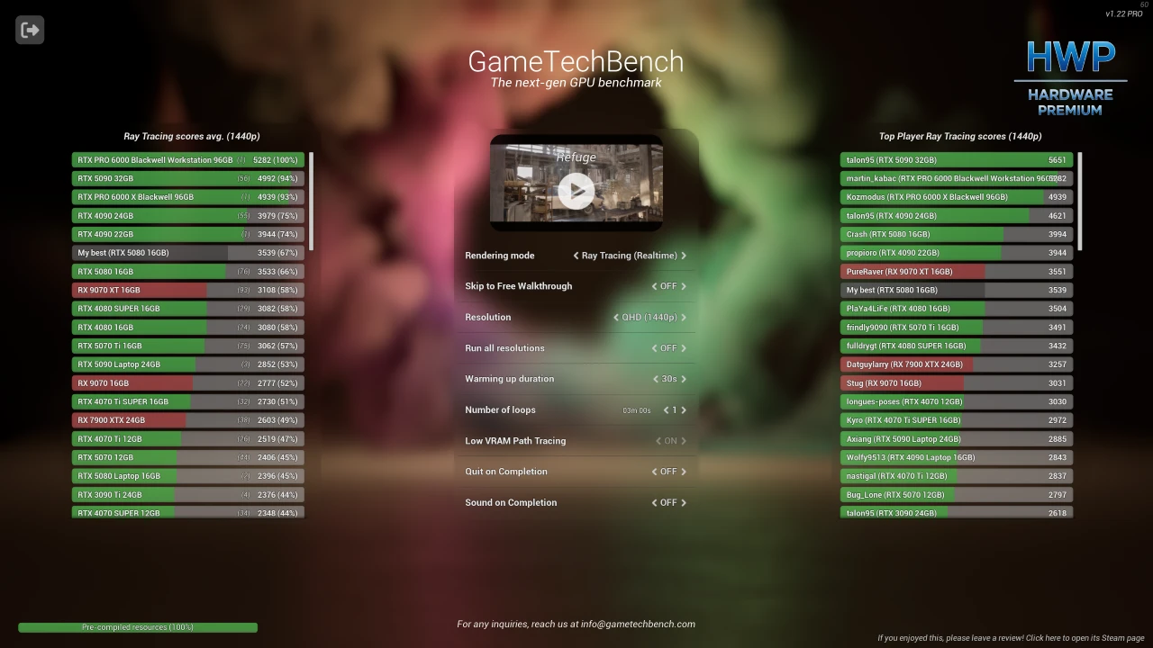 El tercer modo, Path Tracing, está orientado a renderizado offline de máxima calidad. Se ejecuta a resolución Full HD fija para reducir el impacto del tamaño de la memoria gráfica y estandarizar resultados entre sistemas, poniendo el foco en la capacidad de cálculo puro de la GPU.