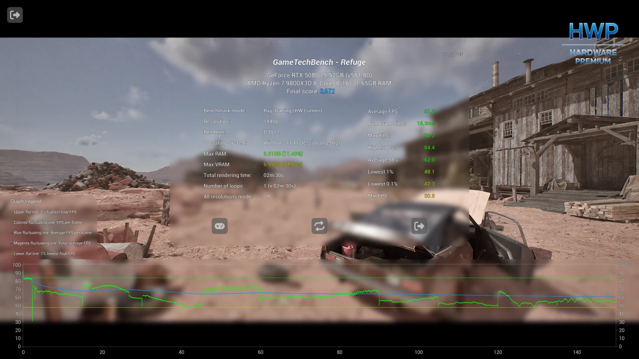 GameTech ofrece varios modos de prueba adaptados a diferentes perfiles de hardware. El modo Raster, sin trazado de rayos, emplea Lumen Software y está pensado para tarjetas gráficas compatibles con DirectX 12 y Shader Model 6 que no disponen de aceleración por hardware para Ray Tracing. Este modo amplía la compatibilidad a GPUs equivalentes a una GTX 1660 con 6 GB de VRAM.