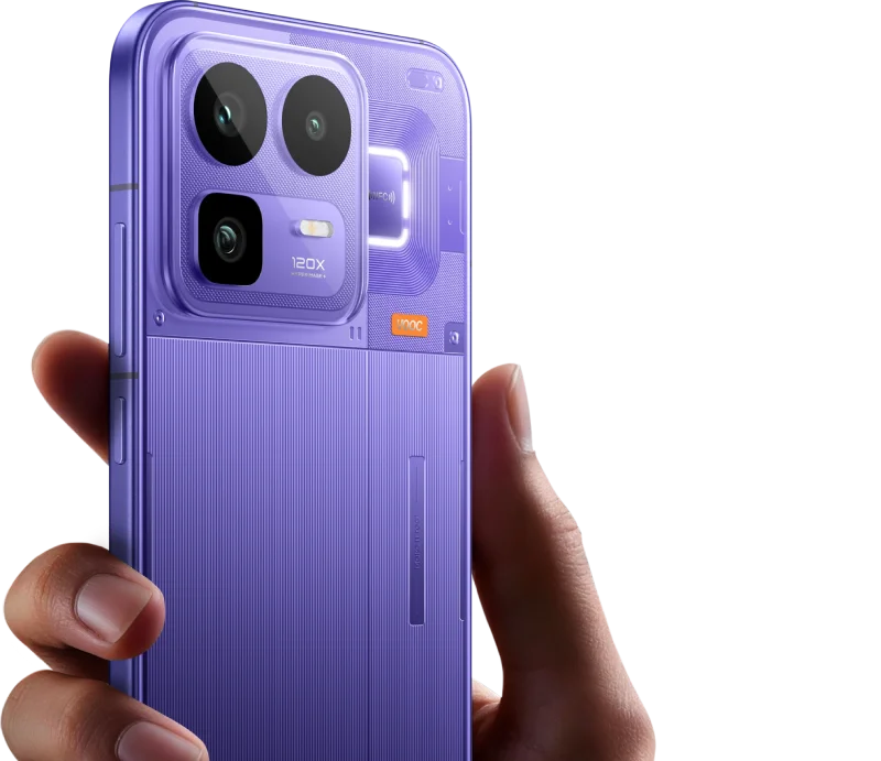 Está disponible en Cyber Purple, Origin White y Mecha Gray, con un acabado que juega con distintas profundidades y texturas para generar efectos de refracción de la luz. El marco metálico y el cristal trasero rematan un conjunto que no busca pasar desapercibido.