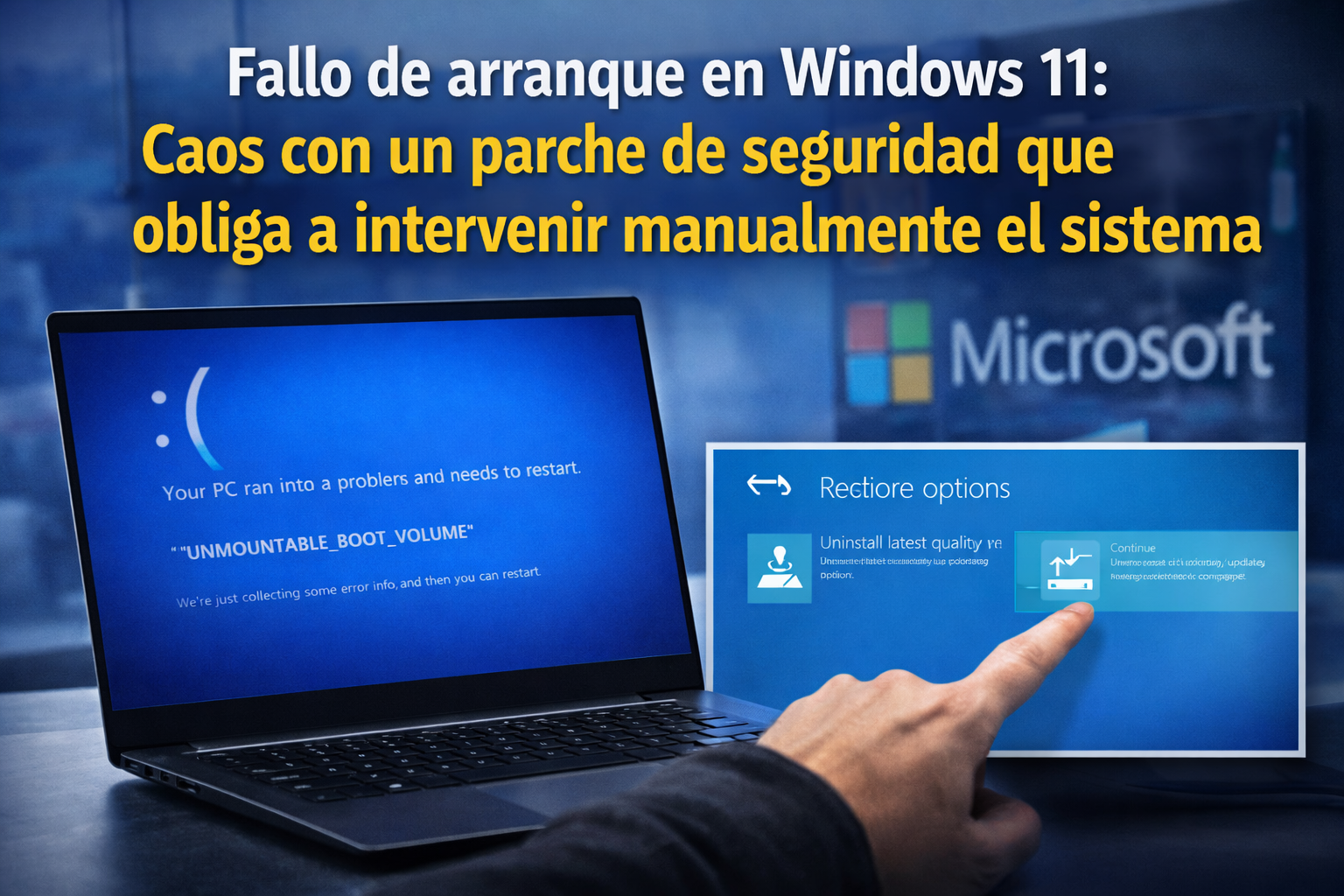 Microsoft ha confirmado haber recibido un número limitado de reportes, todos ellos con un patrón común. Los dispositivos afectados muestran una pantalla negra acompañada del mensaje de error y el código de detención “UNMOUNTABLE_BOOT_VOLUME”, tras lo cual el proceso de arranque no puede completarse. El sistema no se recupera por sí solo y exige acciones manuales desde el entorno de recuperación.