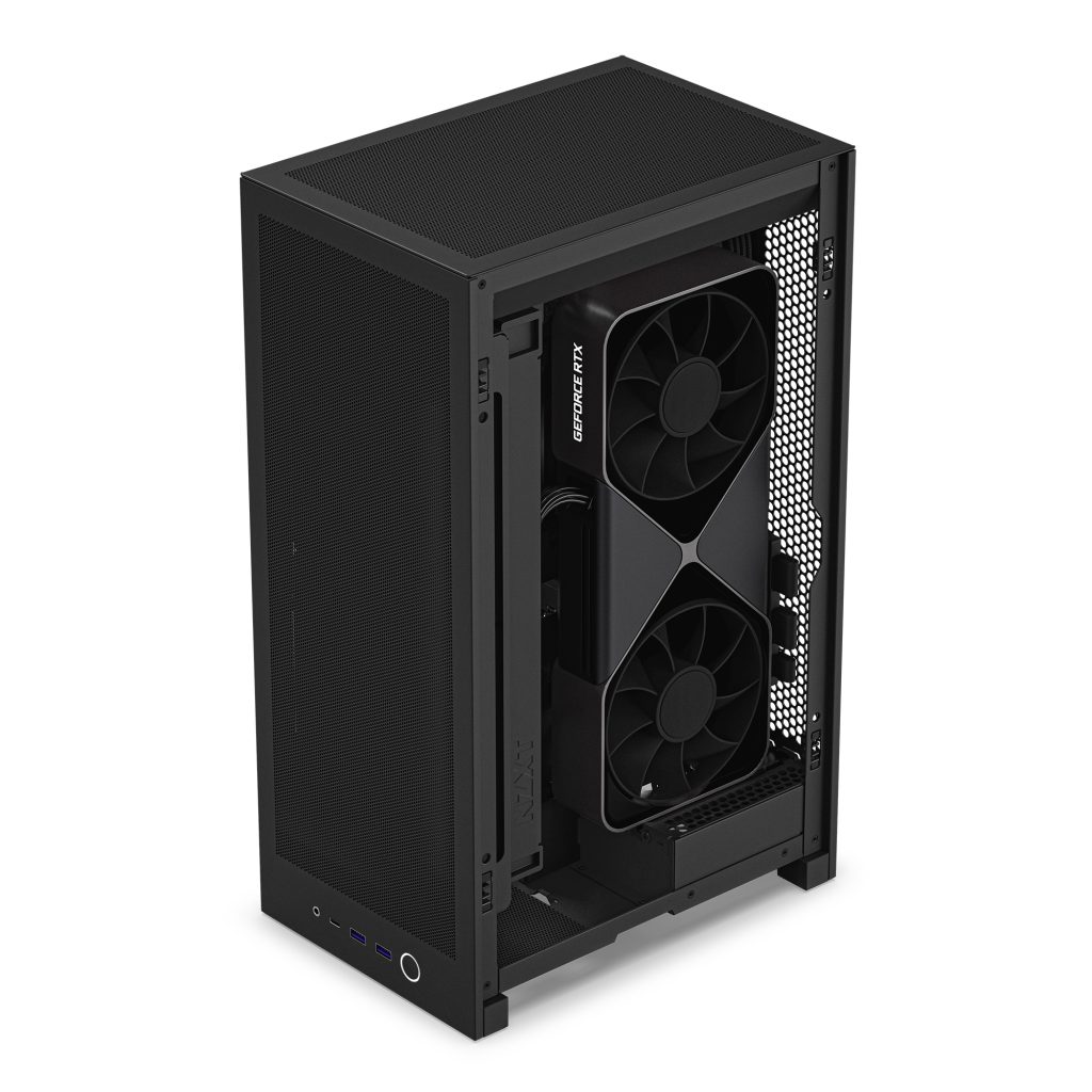 La NZXT H2 Flow Mini-ITX se presenta como una caja vertical de 20,7 litros que busca equilibrio entre densidad y ventilación. En un mercado donde muchos chasis SFF sacrifican flujo de aire para reducir volumen, aquí el planteamiento gira alrededor de paneles de malla fina en todos los lados, sin necesidad de herramientas para desmontarlos.