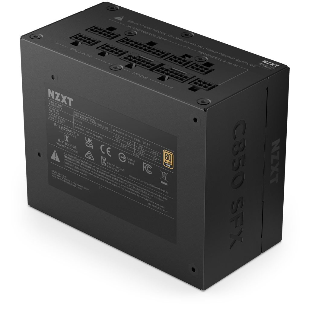 Junto al chasis llega la NZXT C850 SFX, una fuente de 850 W en formato compacto diseñada para equipos exigentes. Cuenta con certificación ATX 3.1, lo que garantiza compatibilidad con las gráficas actuales y futuras que emplean el conector 12V-2×6 de 600 W, evitando adaptadores intermedios.