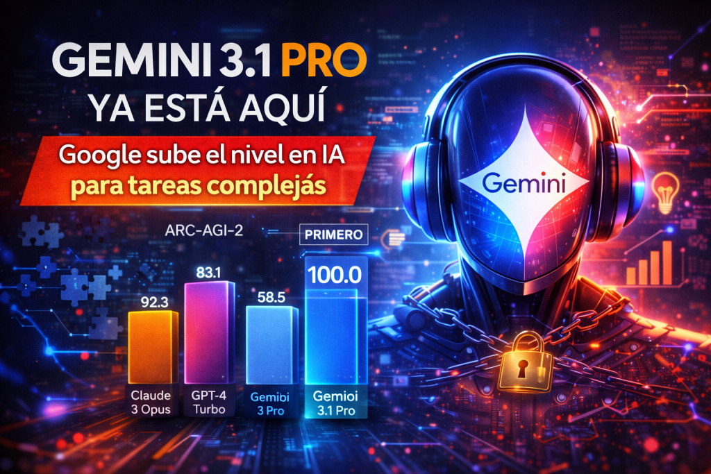 En benchmarks comparativos mostrados en el anuncio, Gemini 3.1 Pro supera a su versión anterior y compite directamente con los modelos más recientes del mercado. Uno de los puntos más destacados es su rendimiento en ARC-AGI-2, un test diseñado para medir la capacidad de resolver patrones lógicos completamente nuevos.