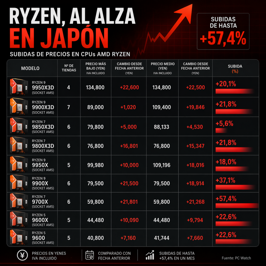 La señal importa porque el mercado DIY japonés suele adelantar movimientos de precios que luego se observan en otras regiones. Aquí el golpe llega en un momento en el que DRAM y GPU ya estaban muy por encima de sus precios originales, y el CPU se suma a una lista que no deja de crecer.