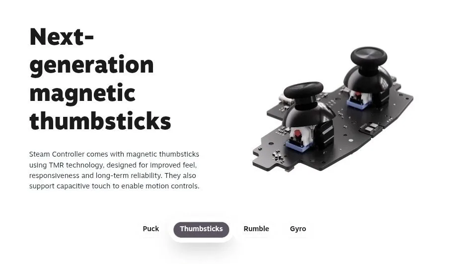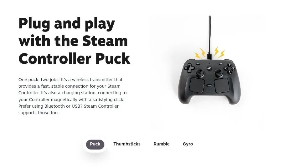 La página recupera también el texto promocional que Valve ya había usado: “Your games at your fingertips” y “All the inputs to play all the games on Steam, wherever Steam is.” Pero no hay compra activa. El enlace lleva de vuelta a Steam para ampliar información, no para iniciar pedidos.