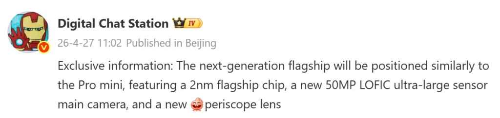 Digital Chat Station, una de las voces habituales en filtraciones de móviles en China, sugiere que la próxima familia insignia de Vivo incluiría tres variantes. En sus comentarios habla de modelos pequeños, medianos y grandes. Eso deja la puerta abierta a una distribución más clásica dentro de la gama. El supuesto “mini” sería el más llamativo por formato, no por ambición técnica.