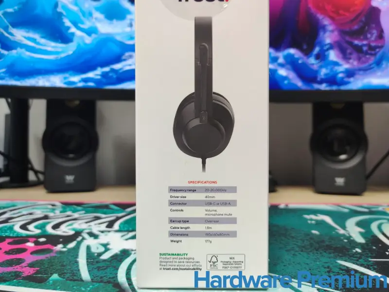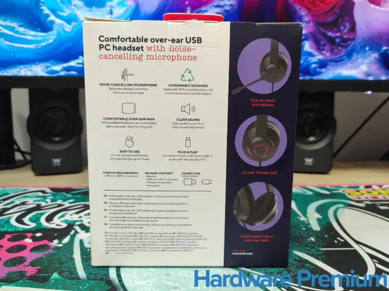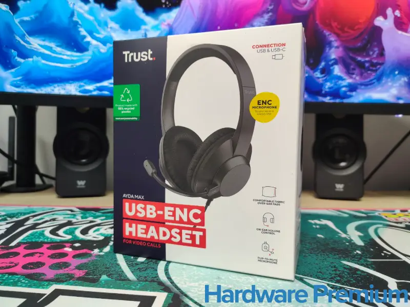 El embalaje de los Trust Ayda Max USB-ENC apuesta por una presentación sobria, en línea con el enfoque de su línea para oficina. La caja transmite de forma clara el mensaje principal del producto: auriculares USB con micrófono ENC pensados para videollamadas. Esto se logra gracias al uso de tipografía en negrita, iconografía simple y un diseño frontal limpio, donde el render del producto ocupa un lugar protagonista.