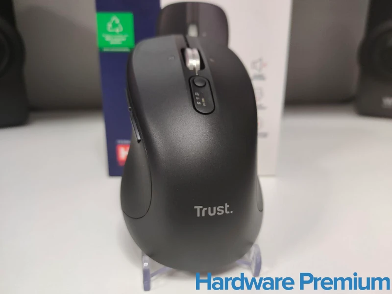 Los botones principales son muy silenciosos, ideales para oficinas compartidas o entornos donde el ruido puede resultar molesto. También, en el lateral izquierdo encontramos dos botones adicionales para navegación rápida, bien posicionados y con un clic firme. Por su parte, el logotipo de Trust se ubica discretamente en la parte trasera, rematando un conjunto que transmite una sensación de calidad superior pese a su precio accesible.