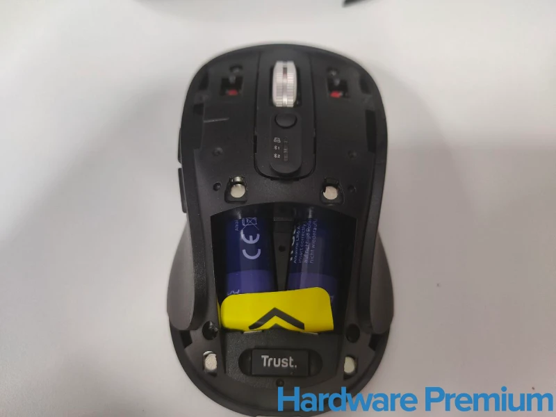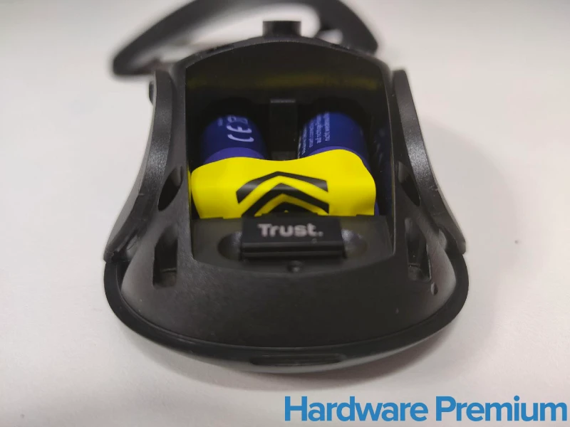 Aunque el Trust Ferro no sorprende por incluir accesorios, sí lo hace por su atención al detalle en el interior. Al retirar la tapa superior, que se extrae fácilmente gracias a su anclaje magnético, nos encontramos con un compartimento limpio y bien organizado, donde se alojan las dos pilas incluidas y el receptor USB de 2,4 GHz.
