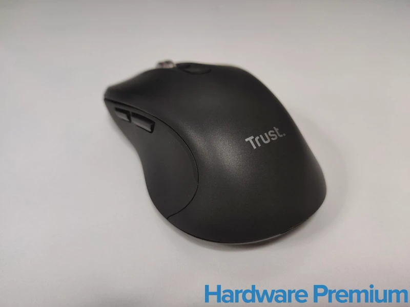 Los botones principales son muy silenciosos, ideales para oficinas compartidas o entornos donde el ruido puede resultar molesto. También, en el lateral izquierdo encontramos dos botones adicionales para navegación rápida, bien posicionados y con un clic firme. Por su parte, el logotipo de Trust se ubica discretamente en la parte trasera, rematando un conjunto que transmite una sensación de calidad superior pese a su precio accesible.