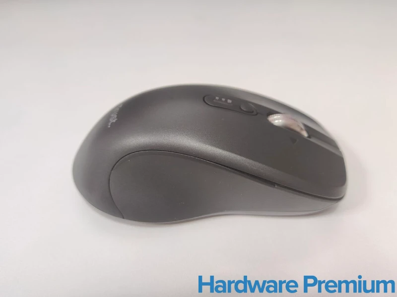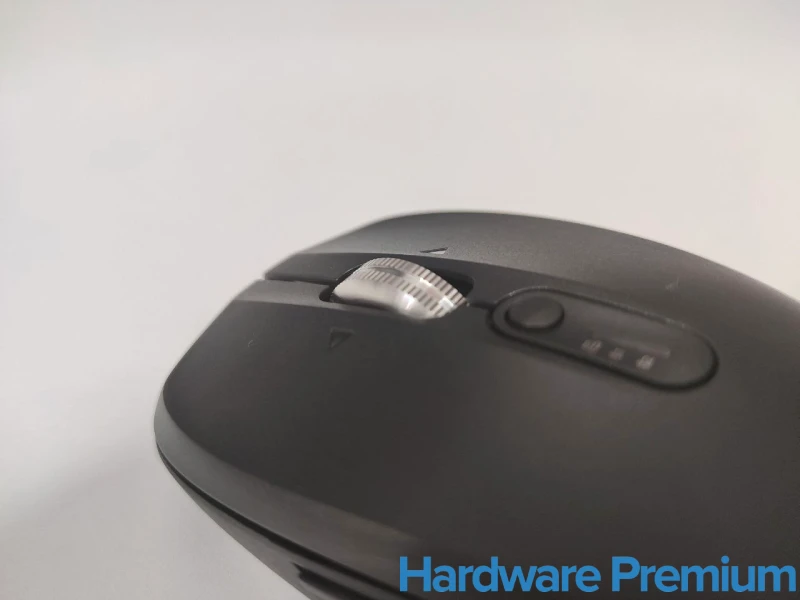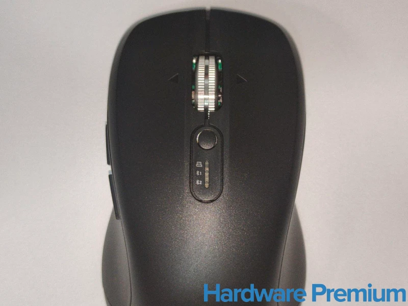 En la parte superior destaca su rueda metálica Hyperscroll, un elemento ofrece una respuesta rápida y natural al desplazarse por documentos o páginas web extensas. Justo detrás de la rueda se encuentran los botones de cambio de DPI y selección de dispositivo, perfectamente integrados en el chasis para mantener la estética minimalista.