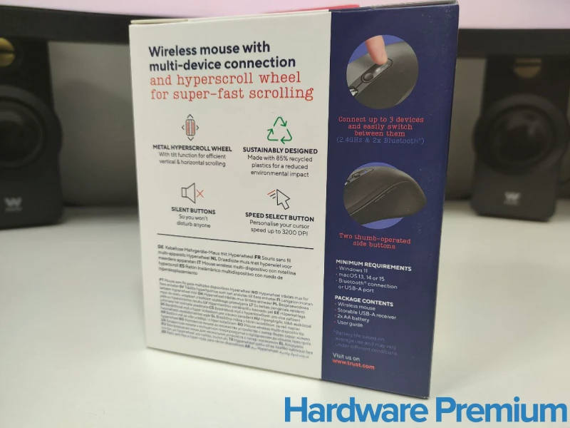 En la parte trasera, Trust detalla las especificaciones más importantes con un estilo informativo y visualmente equilibrado. Se destacan su rueda metálica con desplazamiento horizontal y vertical, el uso de plásticos reciclados en un 85 %, los botones laterales de acceso rápido y la capacidad de conectarse hasta a tres dispositivos distintos.