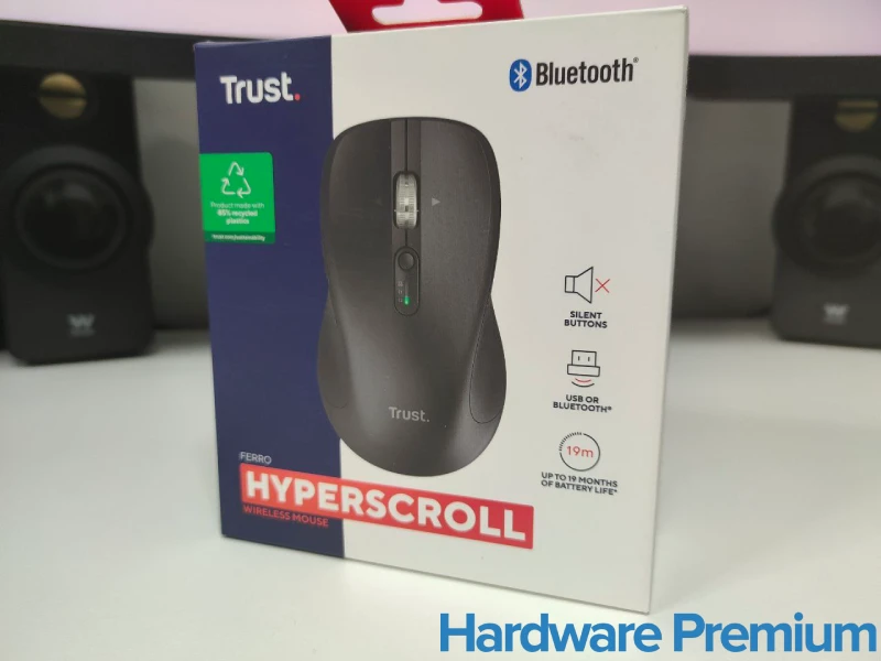 El Trust Ferro Hyperscroll llega en una caja pequeña y bien diseñada, dominada por los tonos blanco y rojo característicos de la marca. En el frontal, el protagonista absoluto es el ratón, acompañado de iconografía clara que resume sus principales ventajas: botones silenciosos, rueda metálica Hyperscroll, autonomía de hasta 19 meses y conectividad dual por USB y Bluetooth.