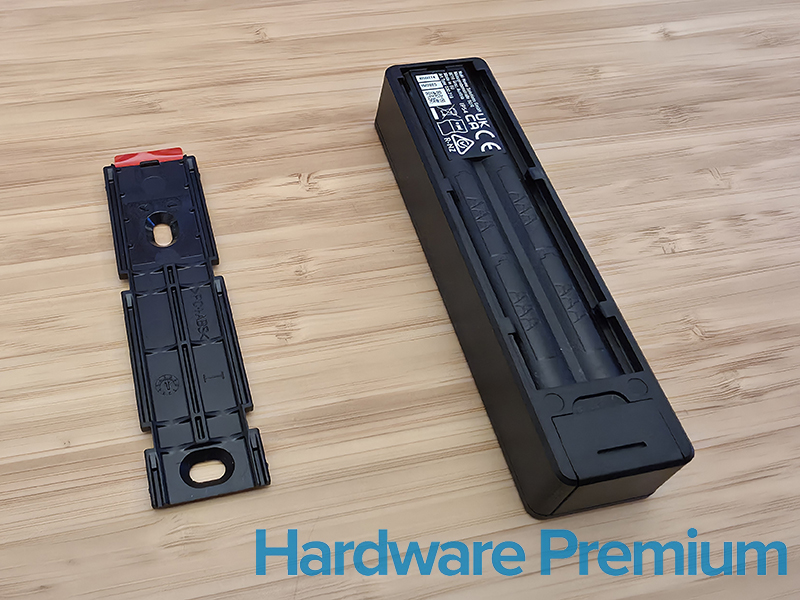 Uno de los mayores cambios de la Nuki Smart Lock Ultra respecto a la Smart Lock Pro 3.0 está en su alimentación. En lugar de pilas AA convencionales, ahora utiliza una batería interna de polímero de litio recargable, integrada y no extraíble. Gracias a ello, el diseño es más compacto (⌀ 57 × 58 mm) y la experiencia resulta más limpia: sin tapas, sin repuestos y con un sistema de carga tan cómodo como elegante.