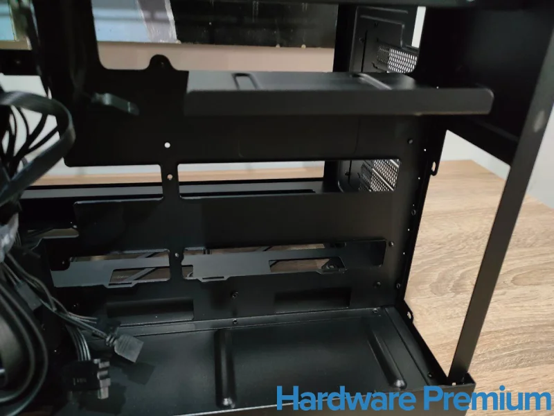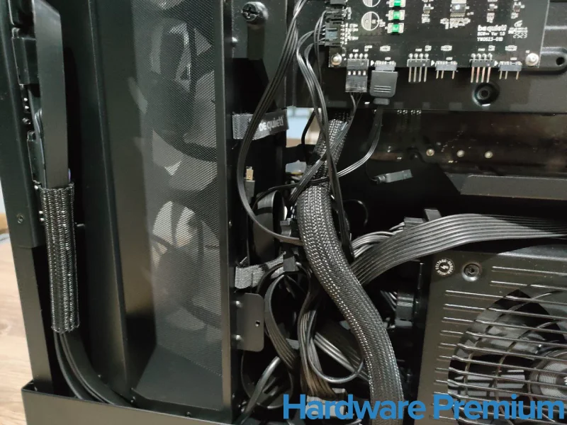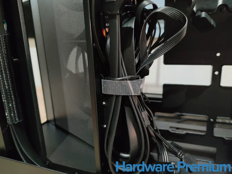 Los cables preinstalados llegan bien guiados y sujetos con velcros reutilizables, lo que denota una cuidada atención por los detalles. La gestión del cableado se siente natural: los pasacables están estratégicamente ubicados, y la zona inferior para la fuente de alimentación dispone del espacio suficiente para esconder el exceso de cables.
