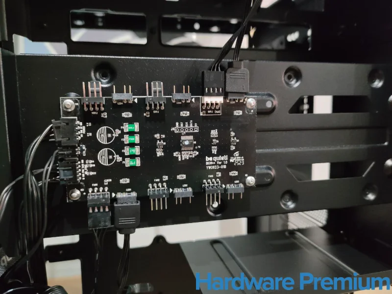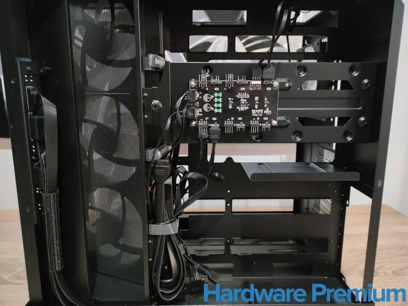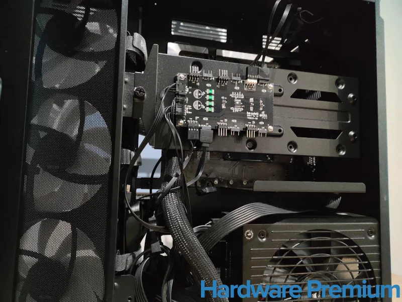 El protagonismo recae en el hub central de ventiladores y ARGB, una placa generosa y muy bien posicionada, capaz de gestionar simultáneamente varios ventiladores PWM y dispositivos de iluminación.