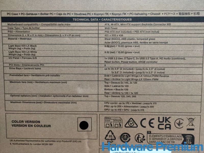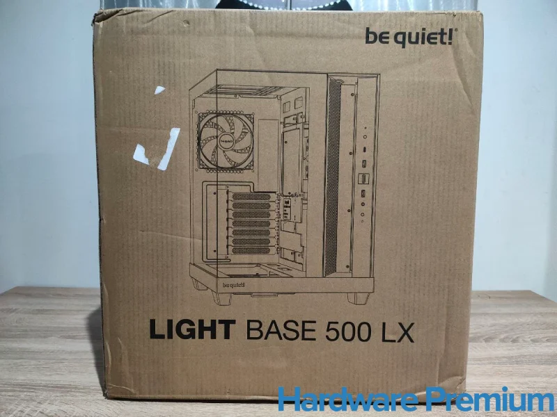 La be quiet! Light Base 500 LX llega en una caja de cartón neutra, en la línea estética habitual del fabricante. En el frontal se incluye un esquema del chasis con el nombre del modelo en gran formato, mientras que en la parte lateral se detallan las especificaciones técnicas completas.