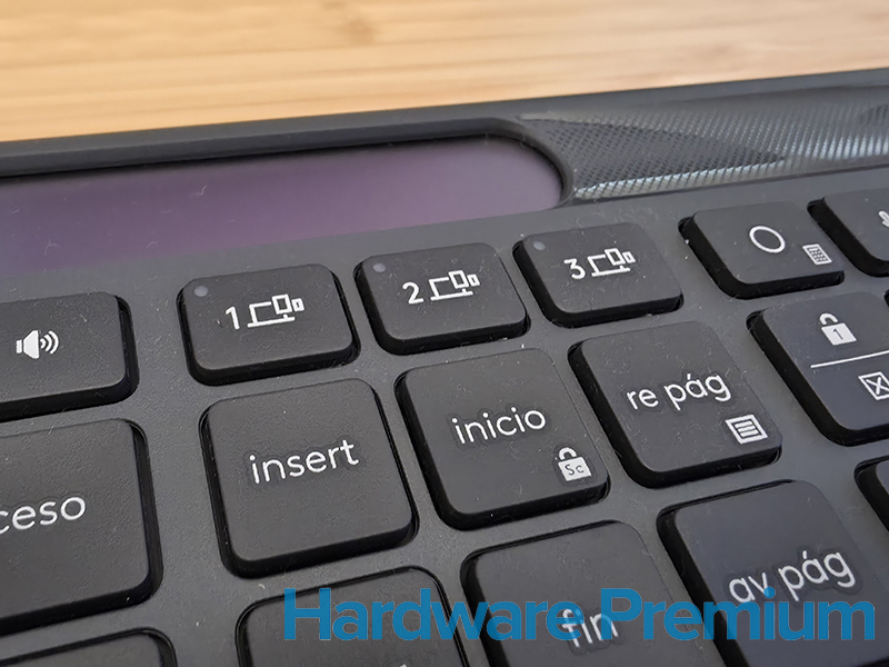 En la esquina superior derecha se sitúan las tres teclas Easy-Switch, el sistema que permite alternar instantáneamente entre tres dispositivos diferentes: por ejemplo, tu PC, tu tablet y tu portátil. La conmutación es inmediata, sin pausas ni reconexiones, ideal para quien trabaja con varios equipos al mismo tiempo.