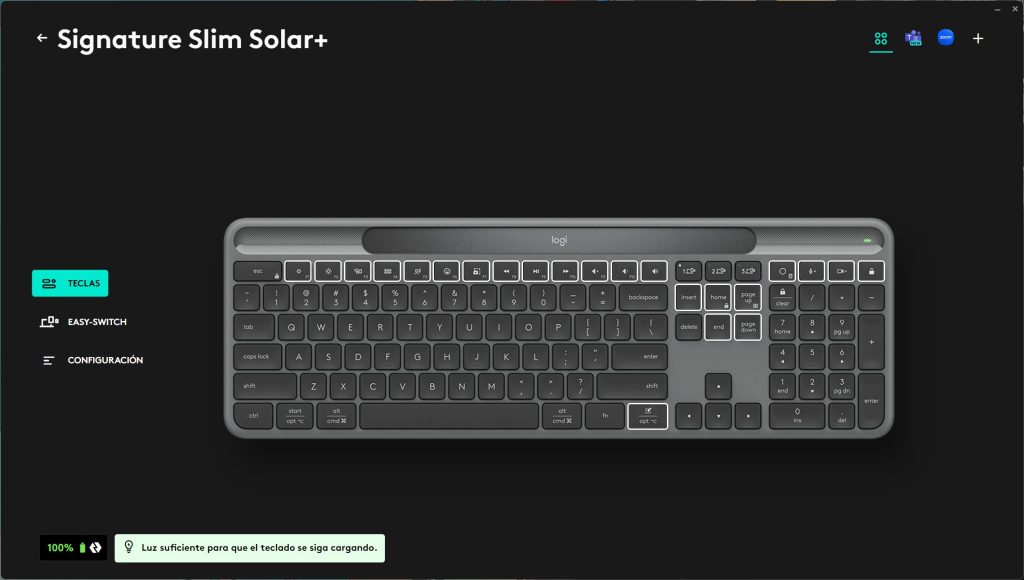 El panel principal muestra el estado de batería y la función LightCharge, con una lectura en tiempo real de la luz ambiental. Si la habitación tiene suficiente iluminación, aparece un aviso de “carga activa”. Si no, te sugiere mover el teclado a una zona más luminosa. Es un detalle pequeño, pero tremendamente práctico.
