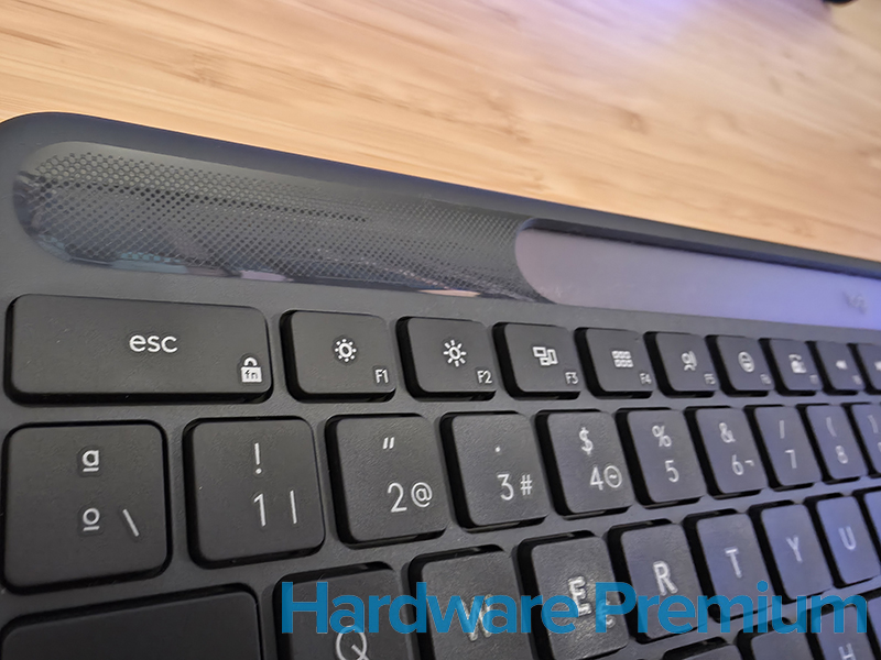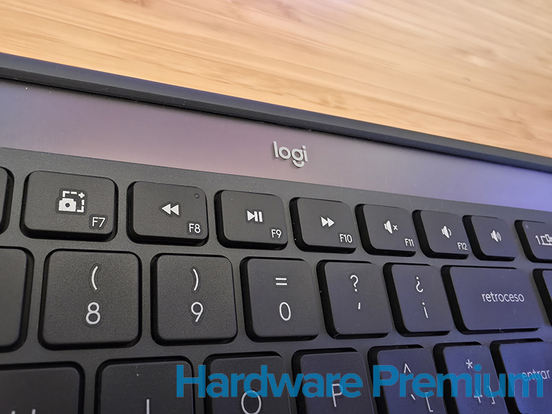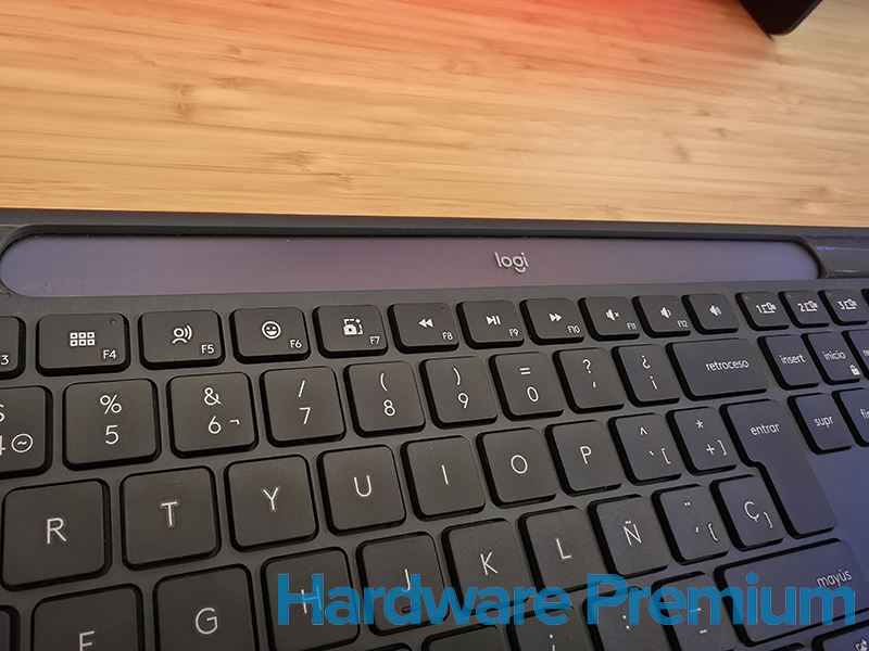En la parte superior destaca una banda solar satinada que oculta las celdas LightCharge. Es el corazón del teclado, aunque apenas se nota. No hay puertos, conectores ni interruptores visibles: Logitech ha eliminado cualquier elemento que rompa la estética o distraiga. Es una apuesta valiente. Si alguna vez te quedas sin energía, solo queda acercarlo a la luz.