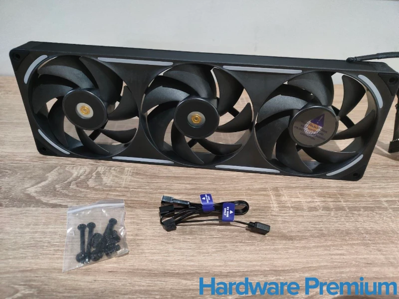 En el interior, la presentación es sencilla pero ordenada: el bloque de tres ventiladores viene perfectamente protegido, acompañado por una bolsita con la tornillería y el mencionado adaptador dentro del cartelito anterior.