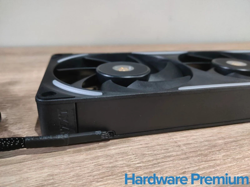 Los detalles de marca también están ejecutados con discreción. El logo NZXT aparece en dos de las cuatro esquinas, grabado en el plástico, sin pintura ni colores extra, y también está presente en la zona trasera donde se integra el cableado hacia el motor. Es una presencia sutil, bien integrada, que complementa el look general del ventilador sin robar protagonismo al diseño.