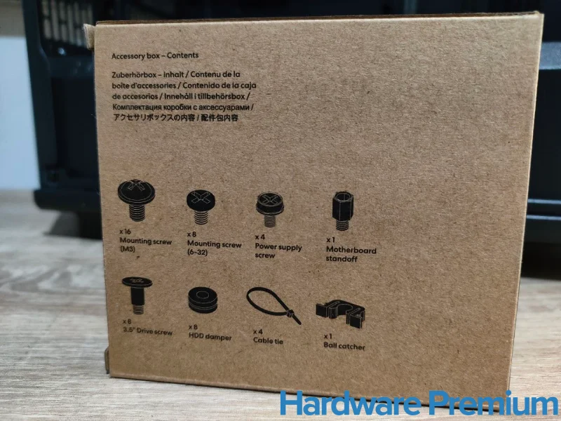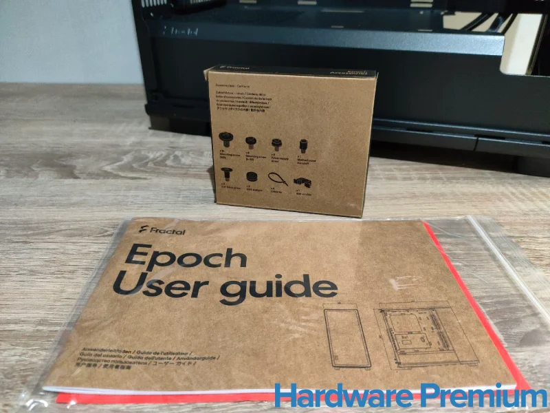 Fractal acompaña a la Epoch con un kit de accesorios muy completo, perfectamente organizado en una pequeña caja de cartón reciclado. Junto a ella encontramos también la guía de usuario, presentada en formato grande, con diagramas que facilitan el montaje incluso si es tu primera vez montando un PC.