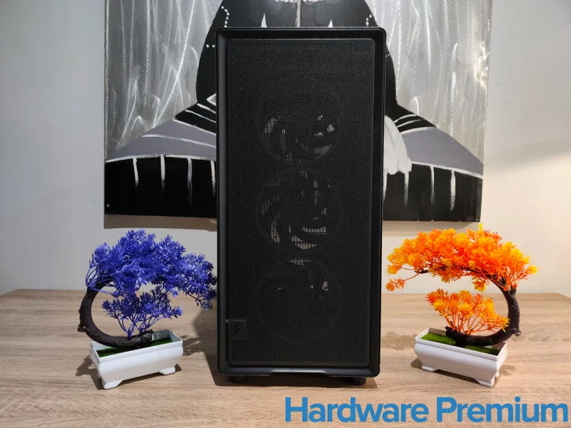 En el frontal, encontramos una gran malla metálica que domina toda la superficie, enmarcada por un borde limpio y sin adornos. Tras ella asoman los tres ventiladores preinstalados, una declaración de intenciones de que esta torre no solo busca ser bonita: está diseñada para rendir. El pequeño logotipo de Fractal en la esquina inferior izquierda está integrado con mucha discreción.