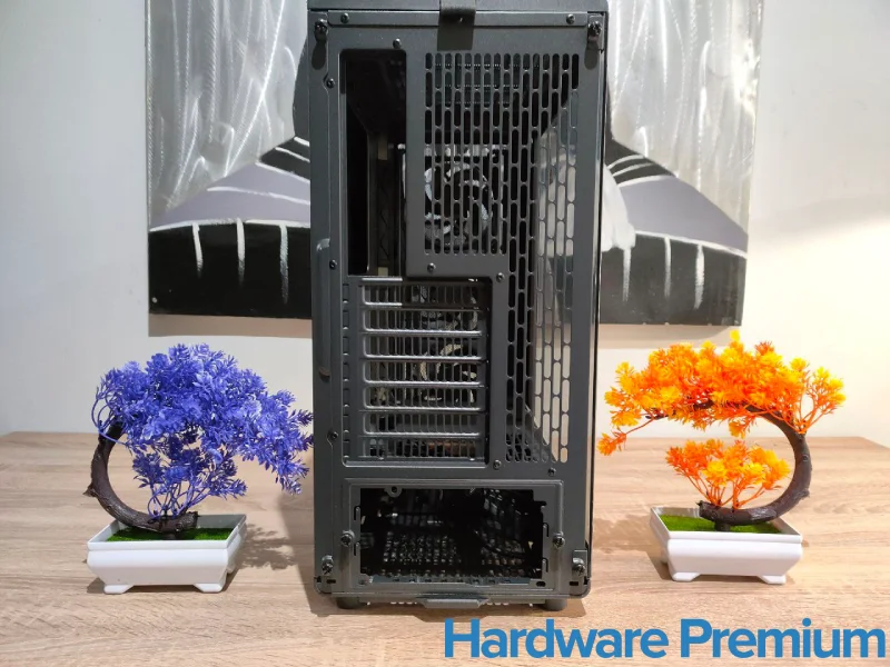 En la parte trasera, el diseño se mantiene práctico: encontramos las 7 ranuras de expansión, una amplia zona de ventilación y la abertura inferior para la fuente de alimentación. Toda la estructura está perforada con patrones alargados que facilitan el flujo de aire y dan continuidad al lenguaje visual del frontal.