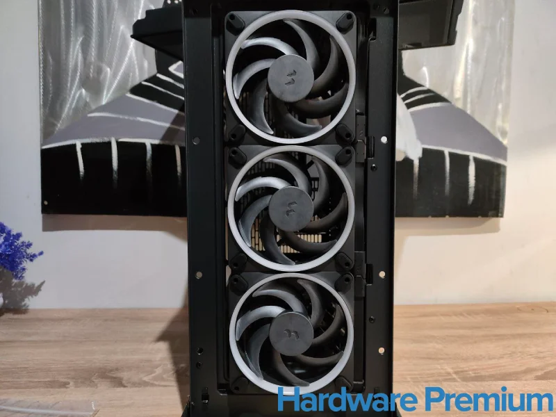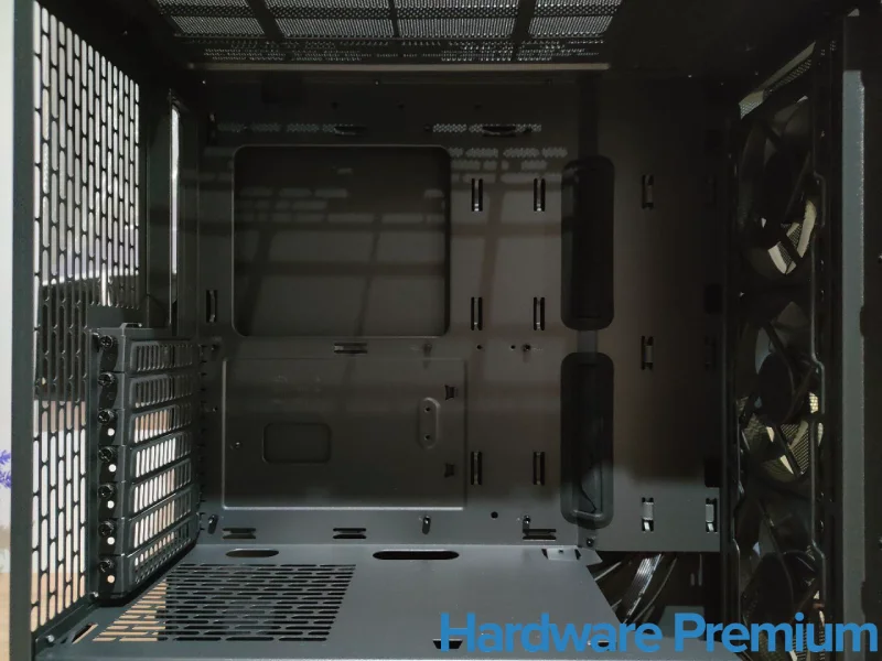 La distribución es cómoda, con numerosos anclajes para bridas, zonas abiertas para permitir el flujo de aire y un frontal completamente despejado gracias a que los ventiladores vienen instalados directamente sobre el bastidor. Esto deja un espacio realmente generoso para GPUs grandes o sistemas de refrigeración personalizados.